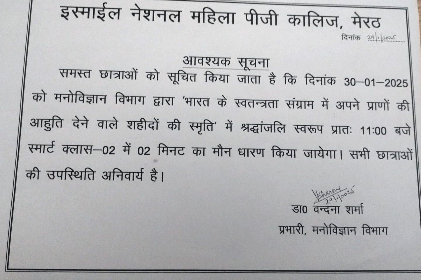 दिनांक 30.01.2025 को शहीदों की स्मृति में मौन धारण किया जायेगा