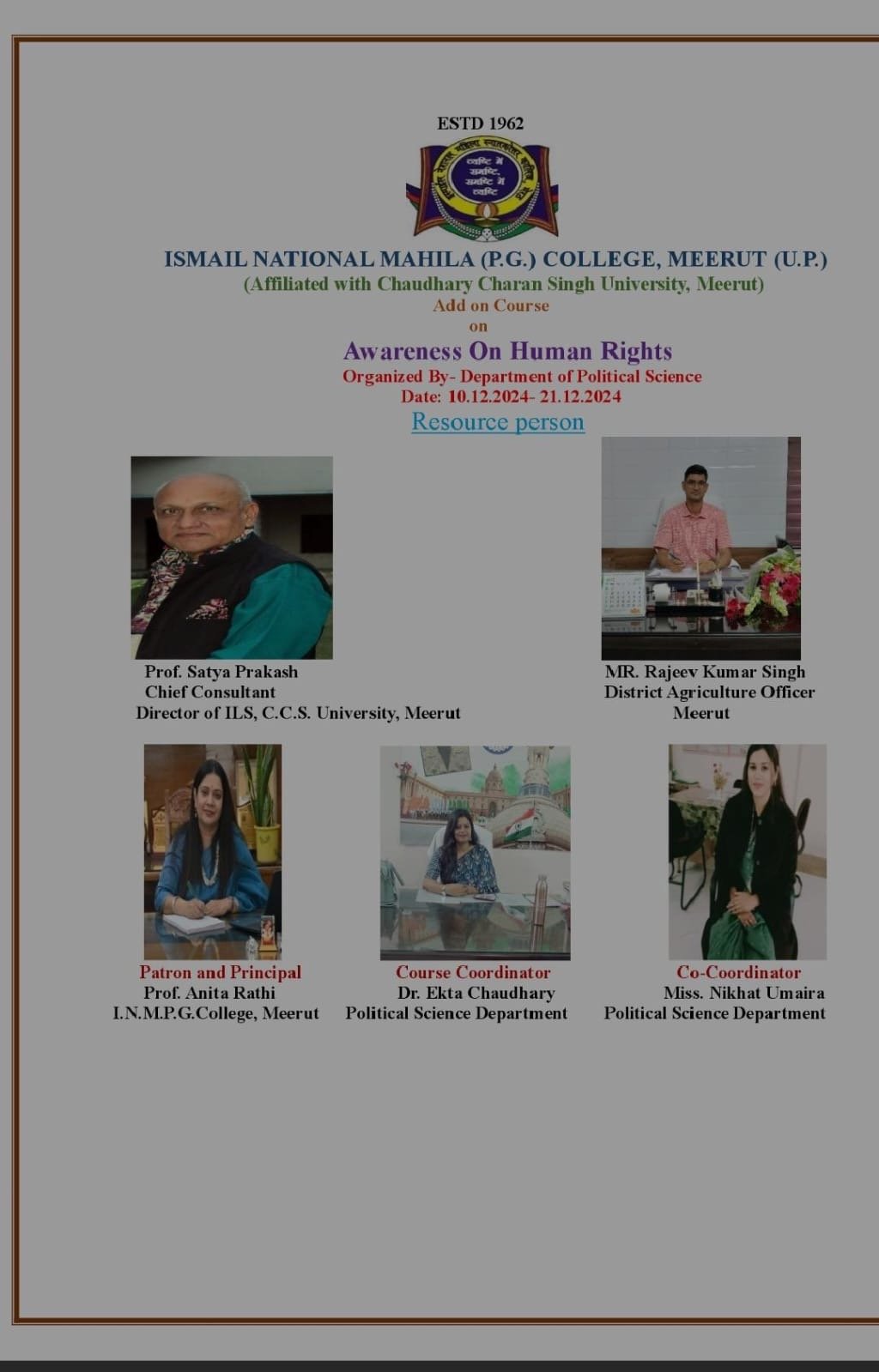 Department of Political Science is going to organizing 15 days Add-on Course on 'Awareness on Human Rights' Last date of registration - 09th December 2024