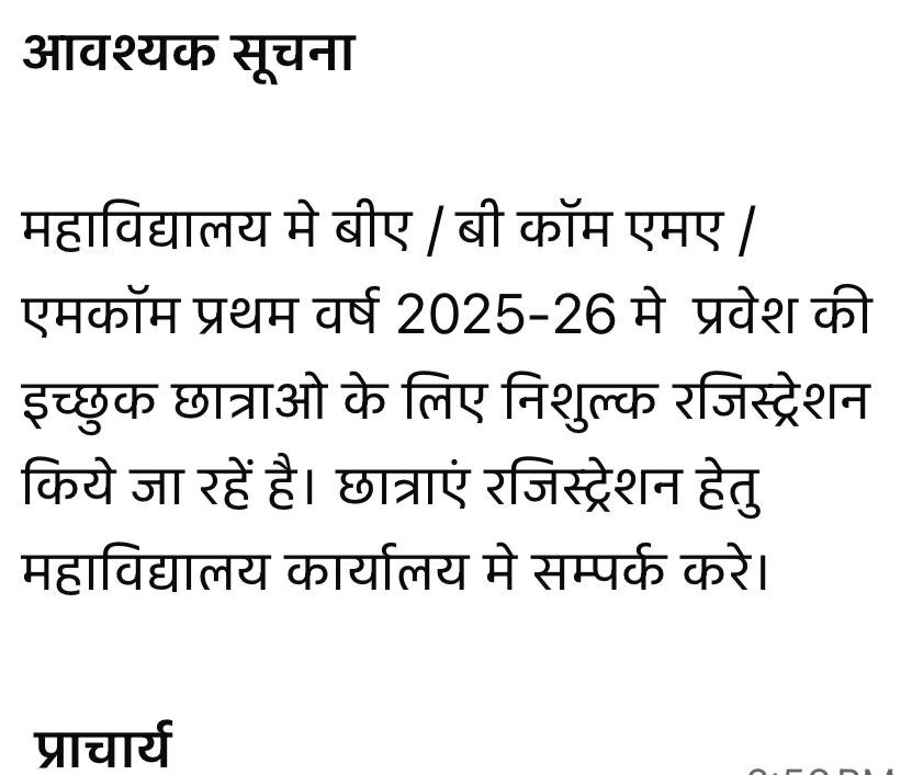 सत्र 2024-25 की बीए, बीकाम एव् बीएससी अंतिम वर्ष मे अध्यनरत 465 छात्राओ की सूची आपको प्रेषित की जा रही है जिनका E Aadhar वेरिफिकेशन होना है, कृपया छात्राओ का शीघ्र E Aadhar वेरिफिकेशन कराना सुनिश्चित करें ।