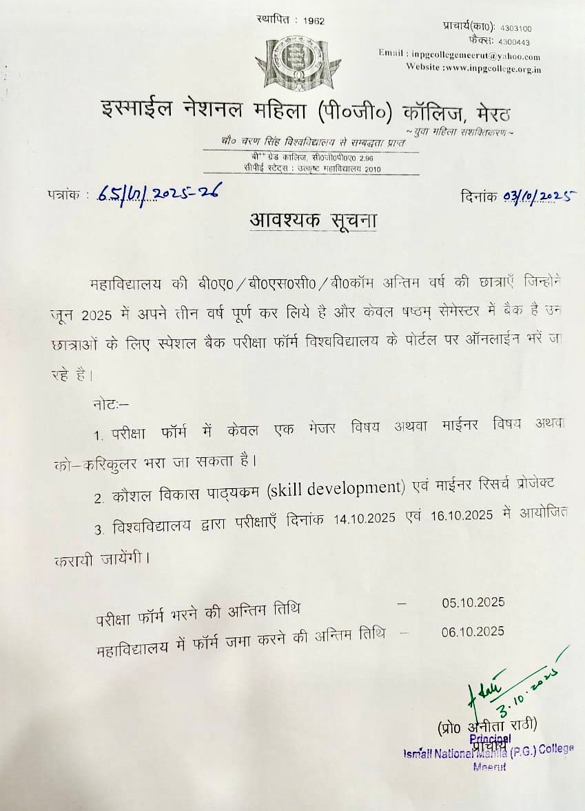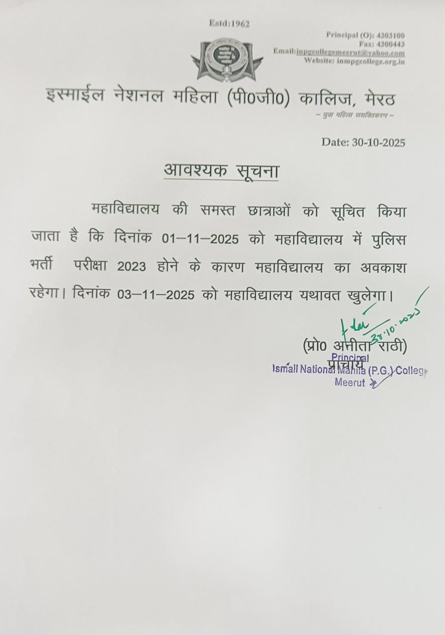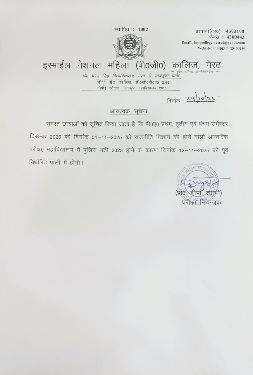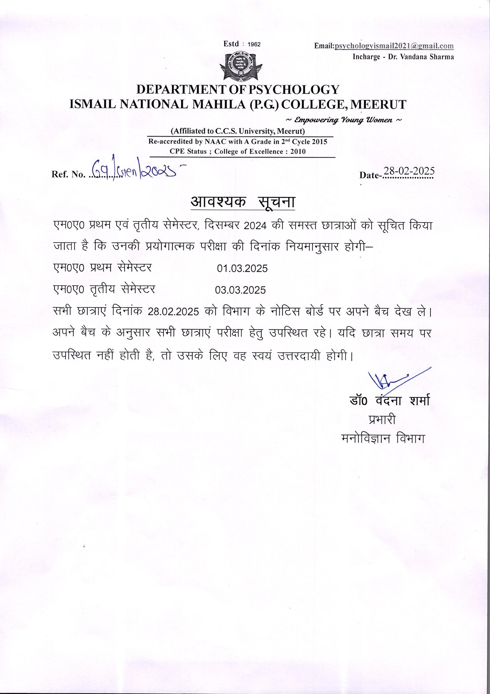 महाविद्यालय के स्नातकोत्तर (एम०ए०), अर्थशास्त्र तृतीय सेमेस्टर दिसम्बर 2024 की मौखिक परीक्षा दिनांक 22-02-2025 को प्रातः 9.00 बजे अर्थशास्त्र विभाग में आयोजित होगी। संबंधित छात्रायें समय से विभाग में उपस्थित होना निश्चित करें।