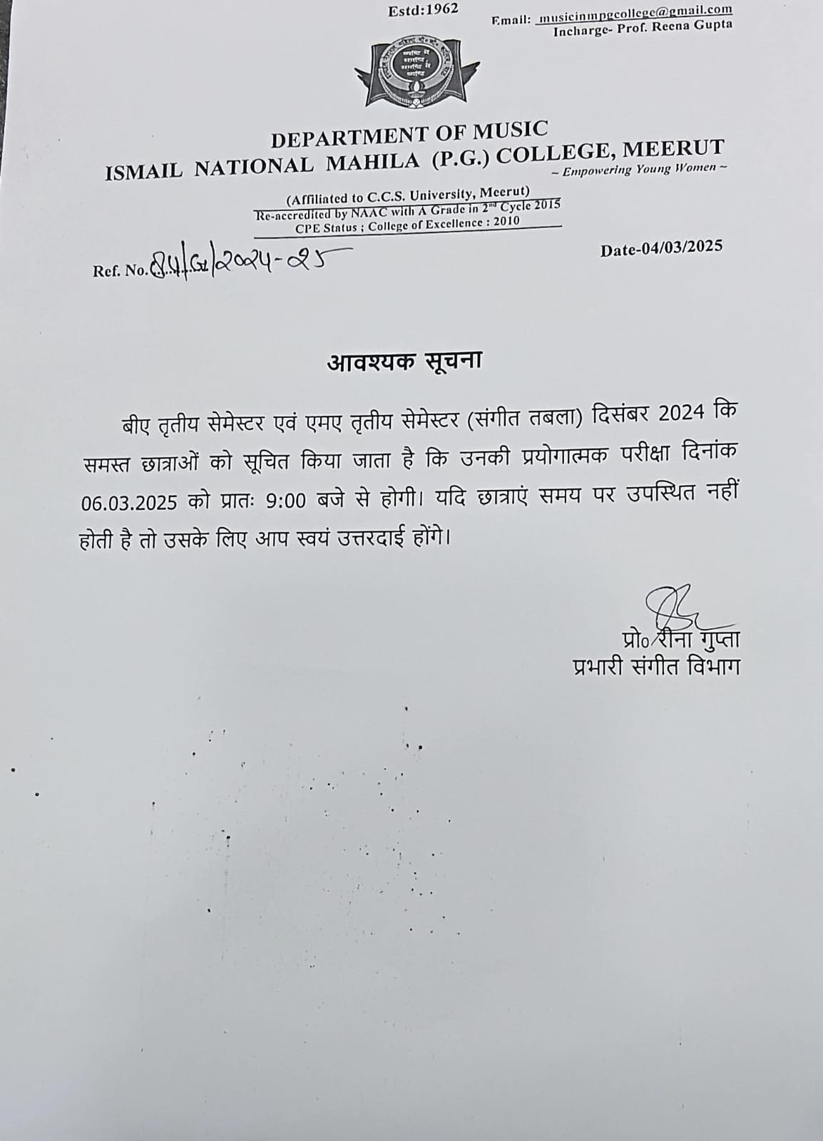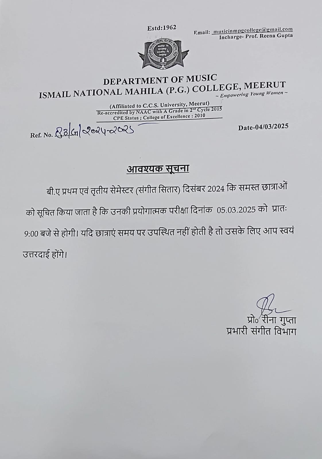 Regarding for B.A. 1 & 3rd Semester December 2024 Practical Examination of Music (Sitar).