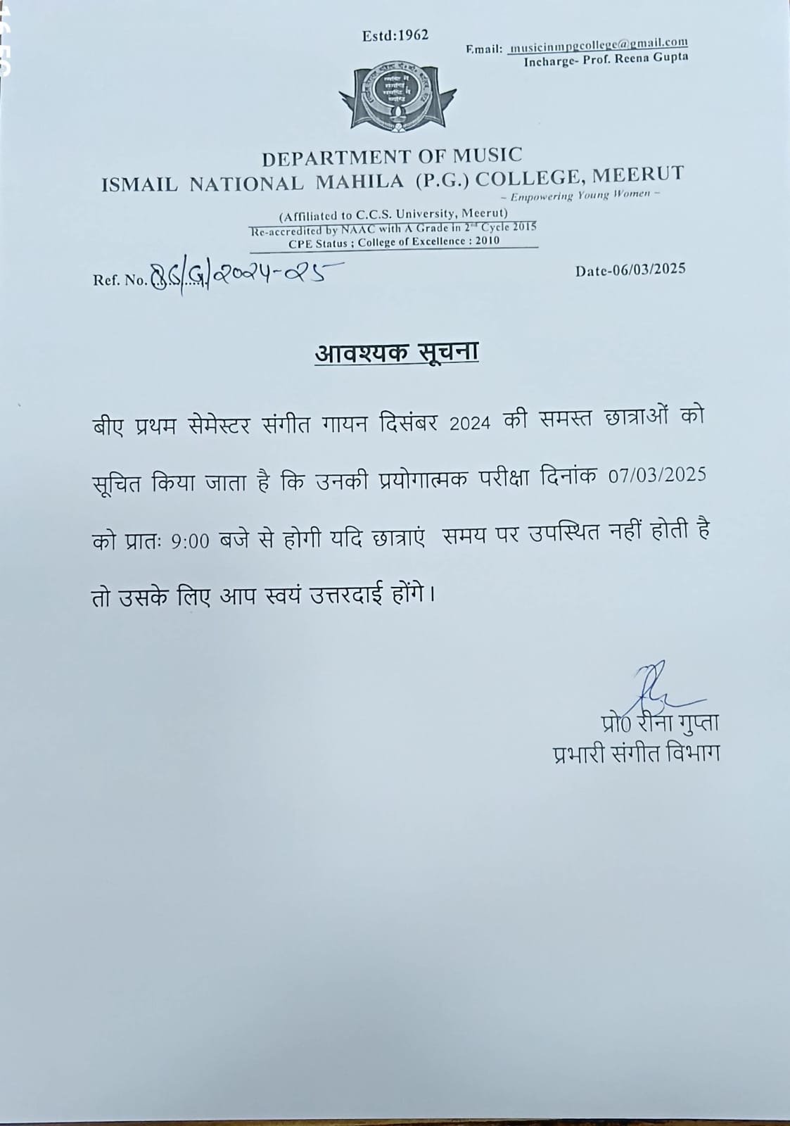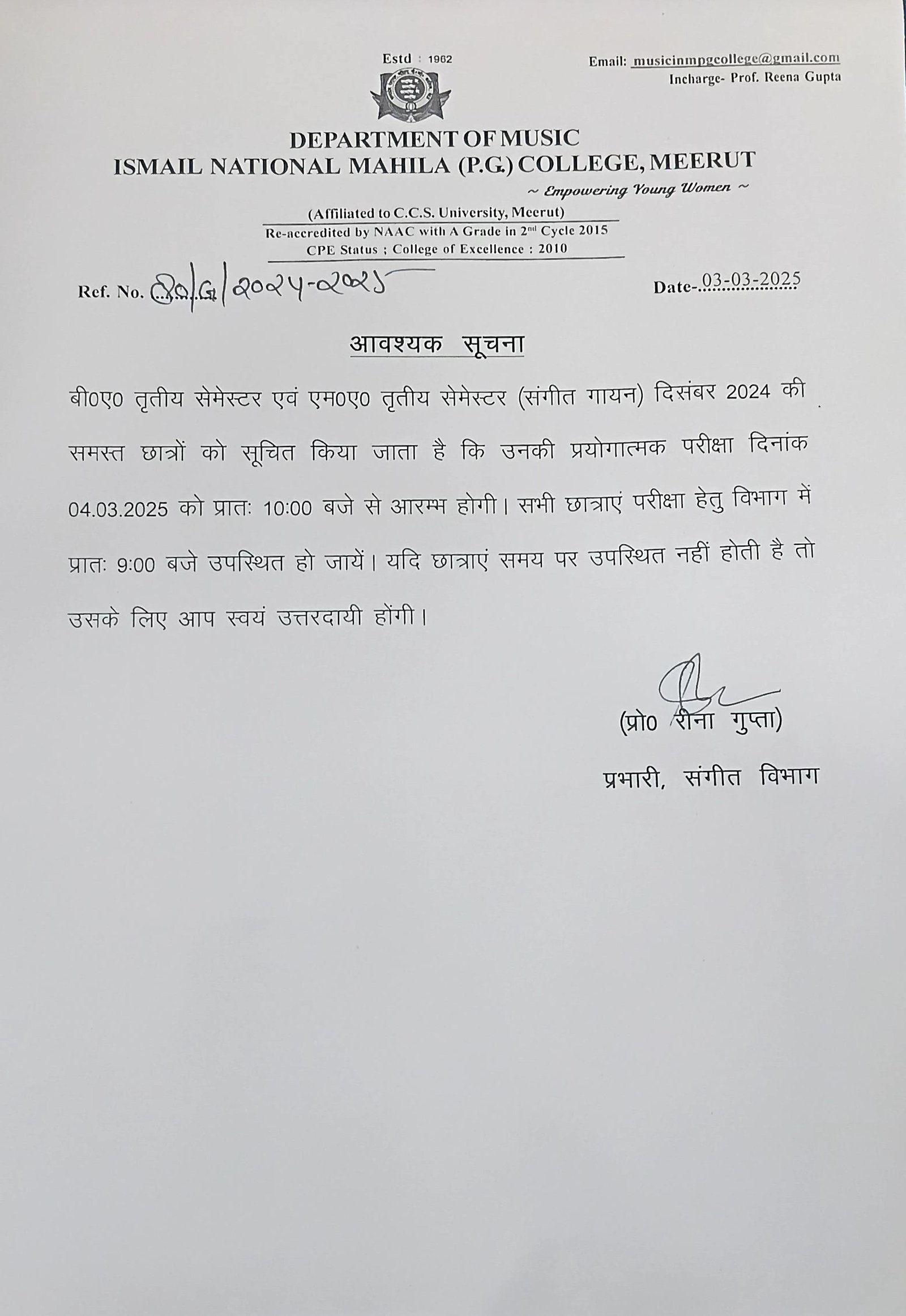 Regarding for B.A. 1st Semester December 2024 Practical Examination of Music (Vocal).