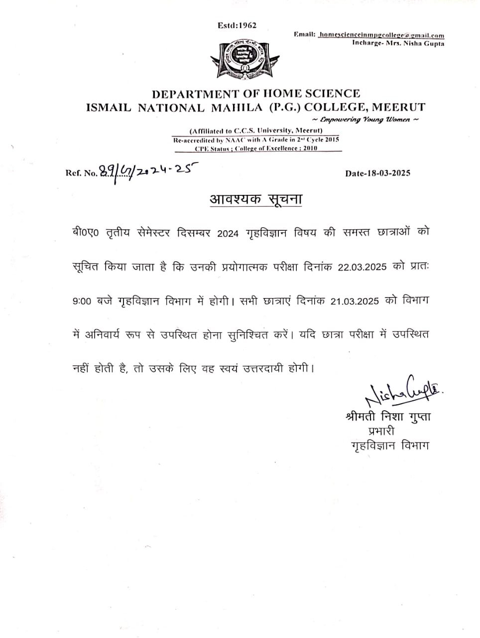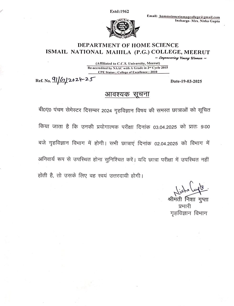 Regarding for B.A. 1st Semester, December 2024 External Practical Examination of Home Science.