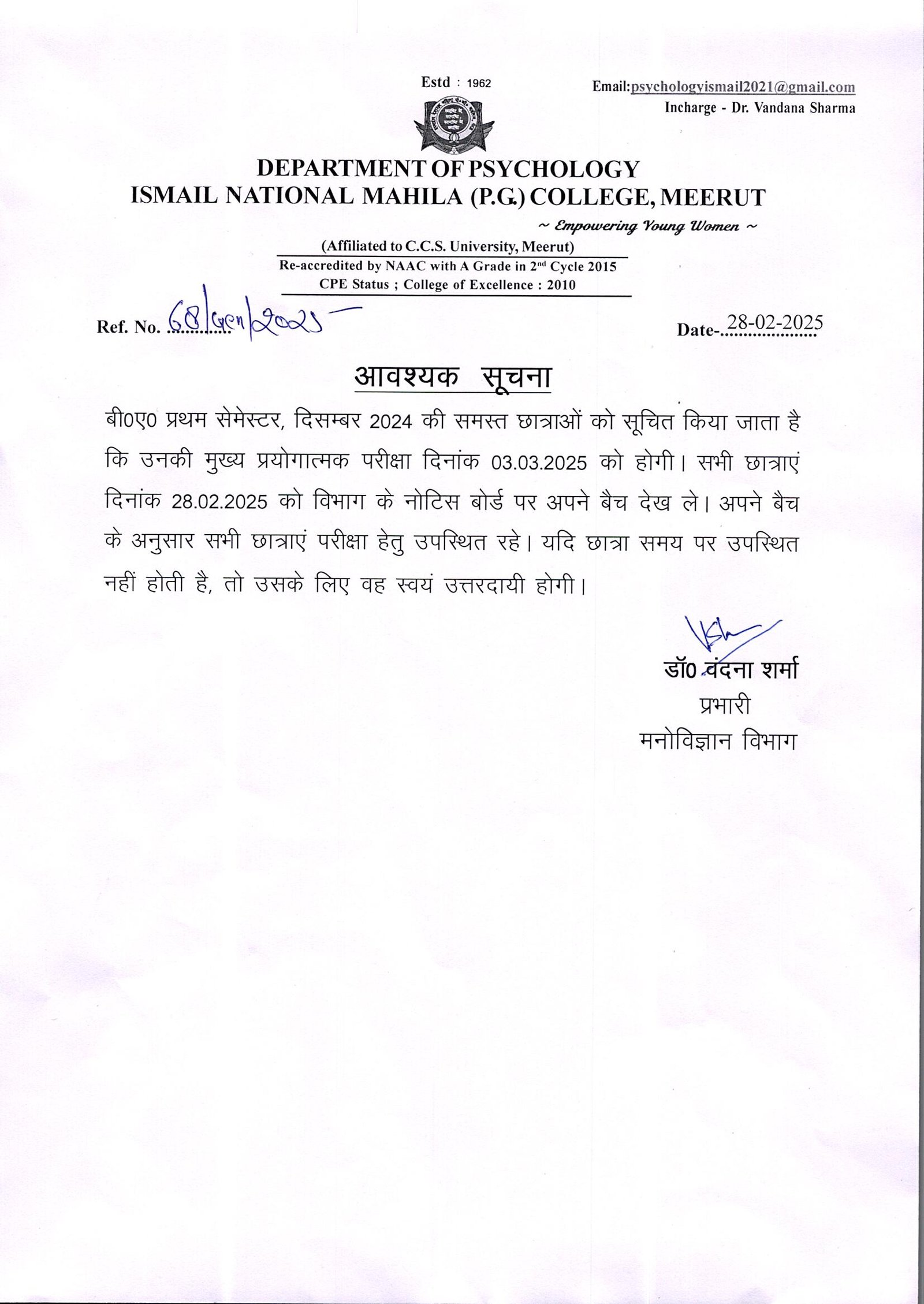 Regarding for B.A. II, IV & VI Semester, June 2025 Practical Examination of Psychology.