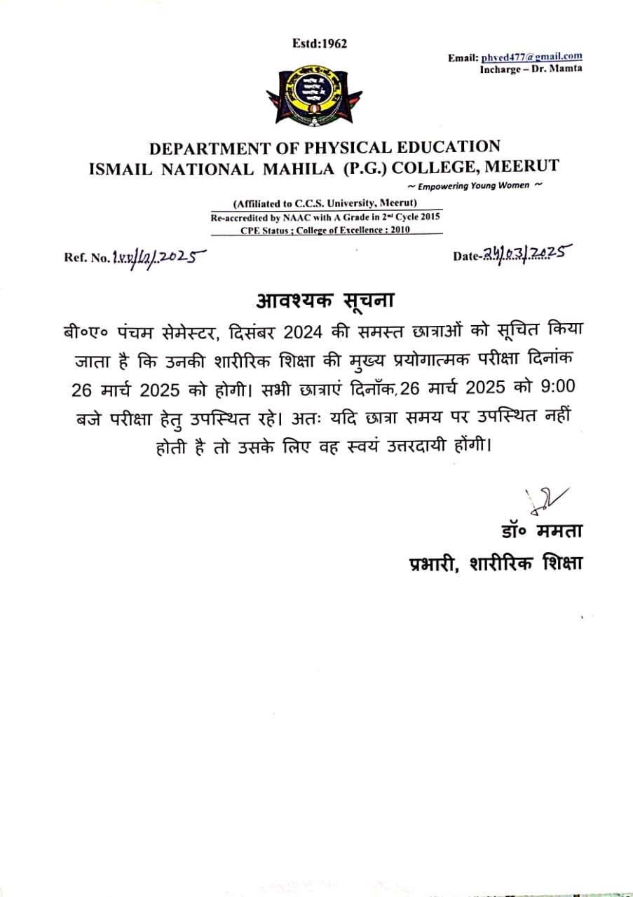Regarding for B.A. 3rd Semester, December 2024 External Practical Examination of Physical Education.
