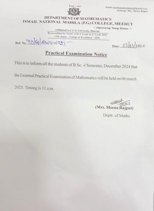 गणित विषय से इण्टर कक्षा पास करने वाली समस्त छात्राओ को सूचित किया जाता हैं कि इस्माईल नेशनल महिला महाविद्यालय, मेरठ में बी0एस0सी0 (गणित) में प्रवेश प्रारंभ हो चुके है। इच्छुक छात्रायें महाविद्यालय में प्रवेश ले सकती है।