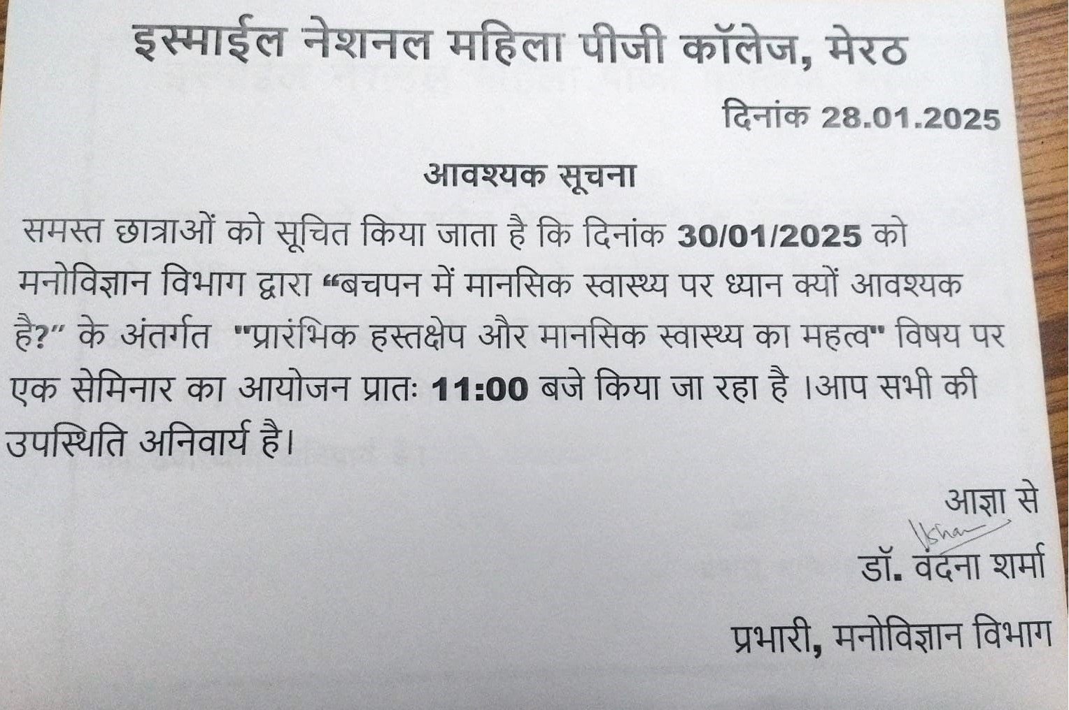 Regarding Seminar on "Early intervention and Mental Health" on 30.01.2025