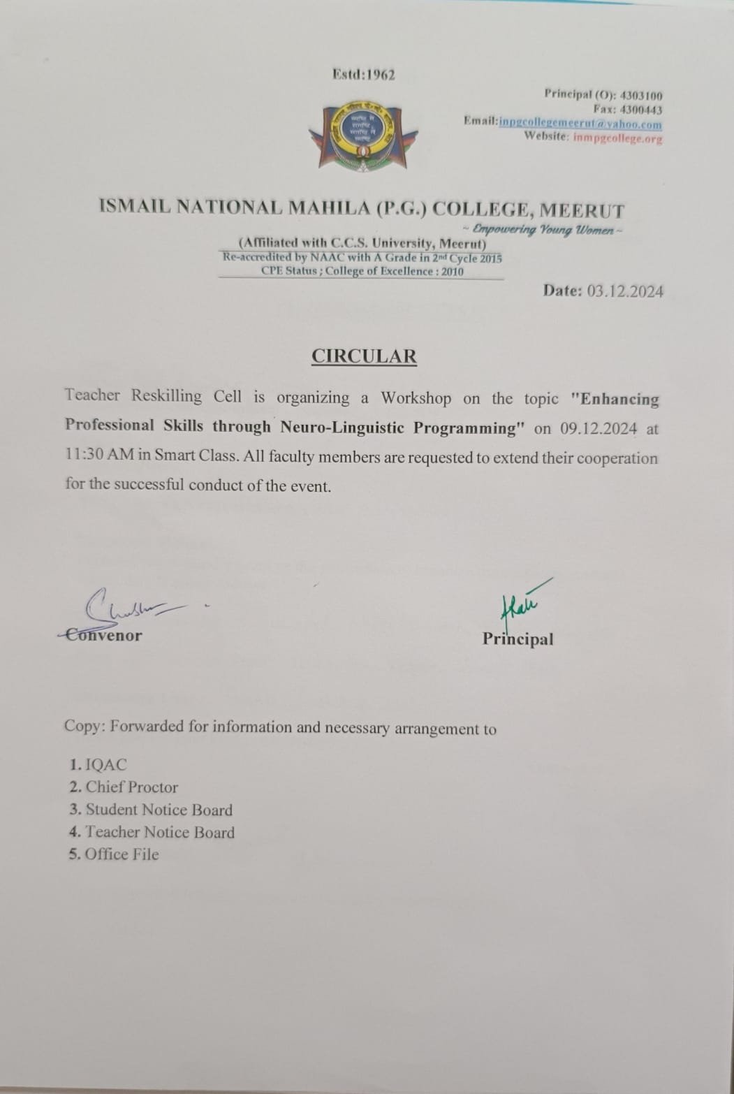 Teacher Reskilling Cell is organizing a workshop on the topic "Enhancing Professional skills through Neuro-linguistic Programming" on 09th of December 2024.